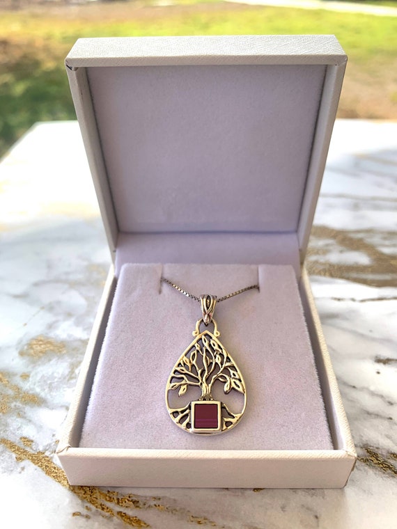 Your 1 Source for Jewish Gifts since 1991. 14K Gold Tree of Life Key Necklace With Ruby Stone Choice of Colors 37000.